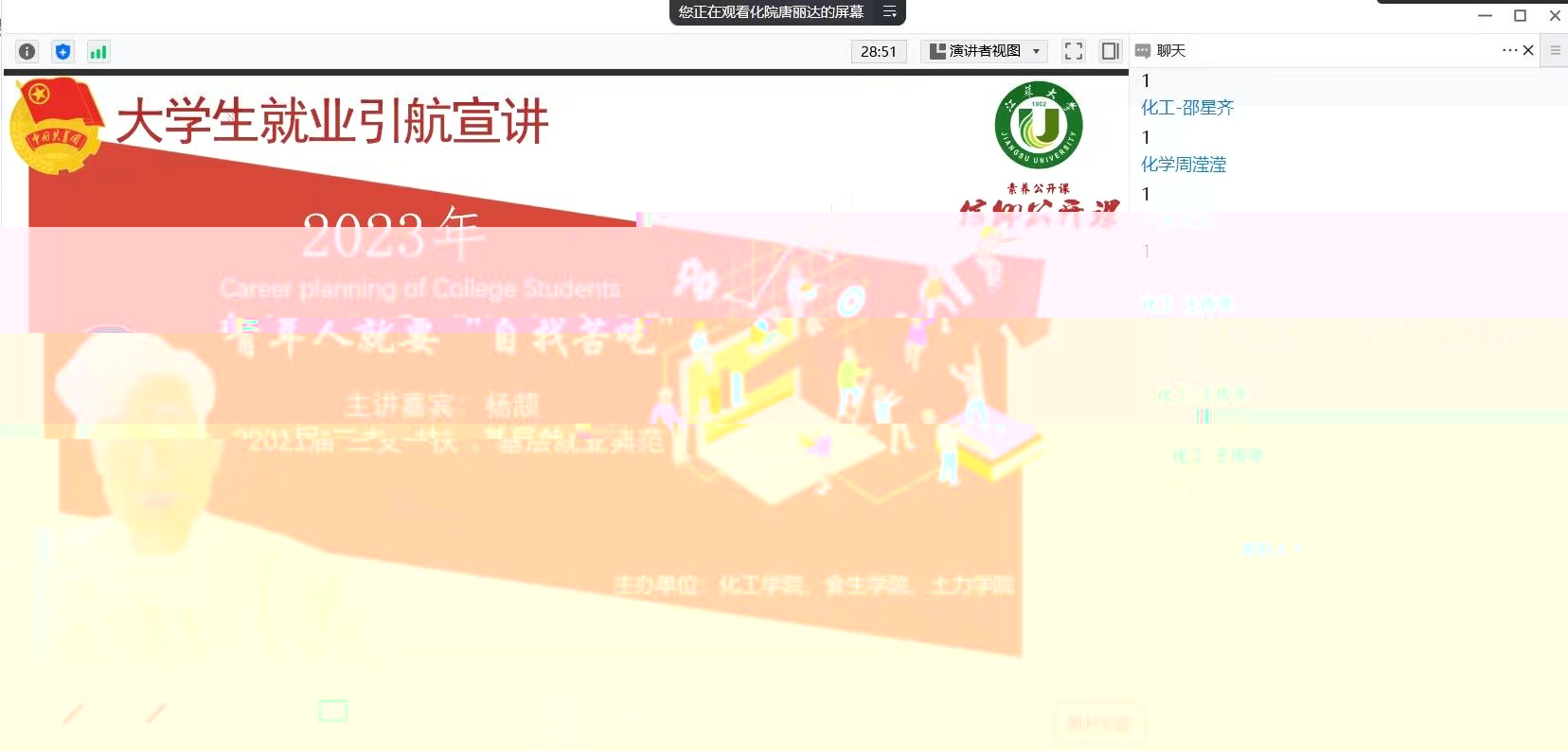 為了提高大學生的求職競争力與就業能力,幫助學生明确職業規劃方向,菠菜技术交流论坛團委于5月13日晚舉辦就業領航宣講活動。此次講座以線上分享的形式進行,特邀2021屆楊颉同學作為主講嘉賓,化工學院師生參加了此次講座。